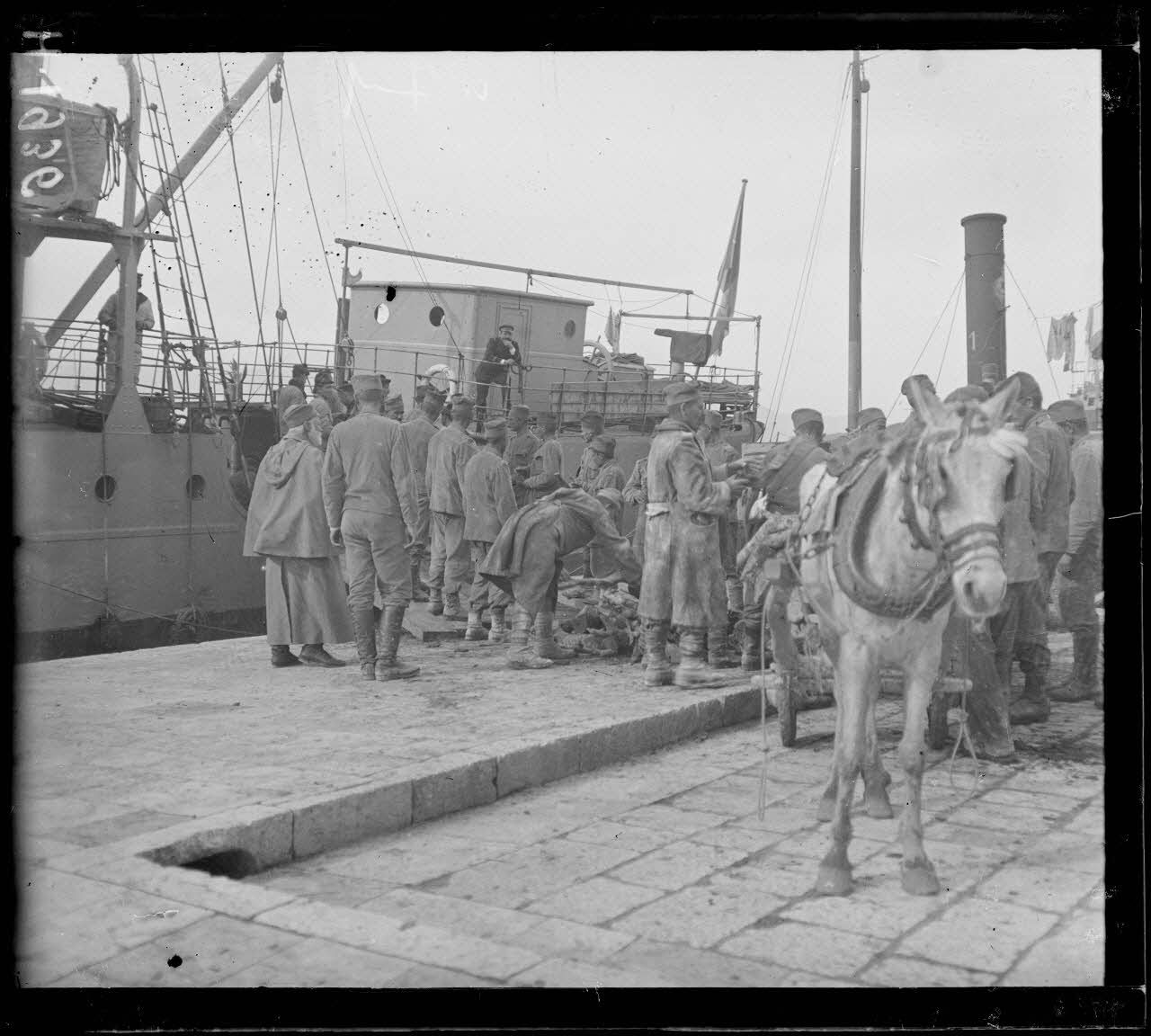 Corfou. Serbes déchargeant du bois de l'Edouard Corbière. [légende d'origine]