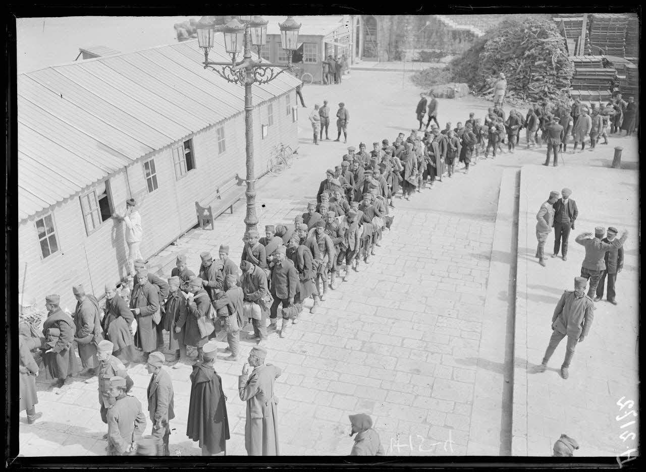 Sur les quais, des soldats serbes sont vaccinés contre le choléra. Une baraque Adrian (construction provisoire en bois et métal) longue de 46 mètres sert de magasin d'artillerie.