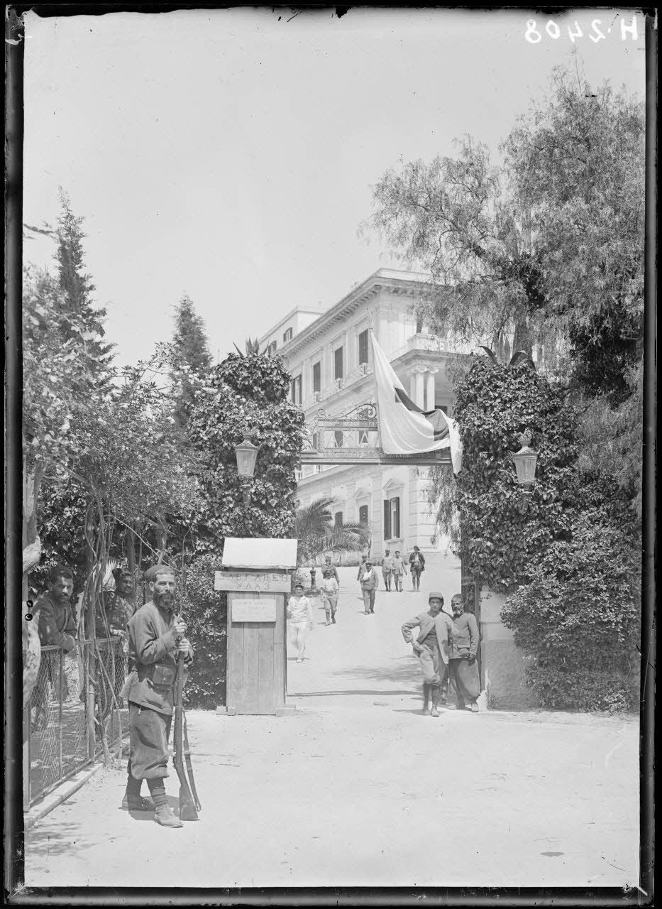 A Corfou, le jardin de l'Achilleion, abritant les appartements impériaux, conserve des statues d'Aphrodite et d'Achille. La terrasse, près de la chapelle et de l'allée des muses, offre une vue panoramique sur la rade. Au sommet de l'Achilleion, le drapeau français flotte au vent depuis le 12 juin 1915. Les hommes du 10e BZ (bataillon de zouaves), sentinelles du bâtiment historique, relèvent la garde.