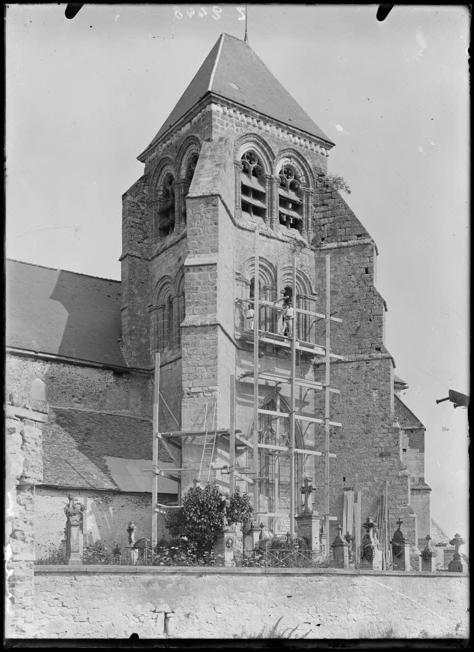 Corroy (Marne). Eglise bombardée en réparation. / Corroy. L'église bombardée en réparation. [légende d'origine]