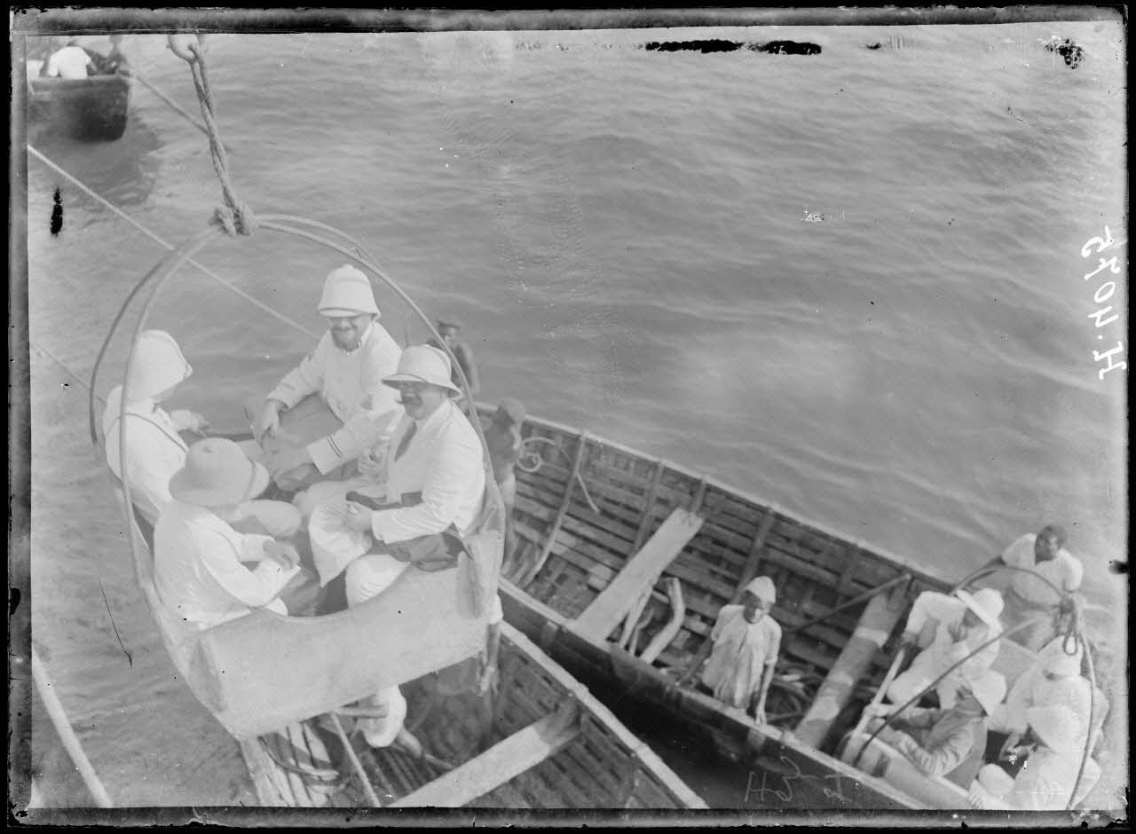 L'opérateur Frédéric Gadmer poursuit son voyage vers le Cameroun à bord de l'"Afrique". Du 1er au 3 décembre 1916, il se trouve au port de Cotonou, où il observe le débarquement de passagers. Au large de Cotonou, il photographie l'équipage du bateau de transport l"Afrique". Le 4 décembre, le paquebot arrive dans la rade de Douala, au Cameroun, où il est accueilli par le "Margareth Elizabeth", yacht de l'ancien gouverneur allemand de la colonie, qui vient se ranger à son bord.