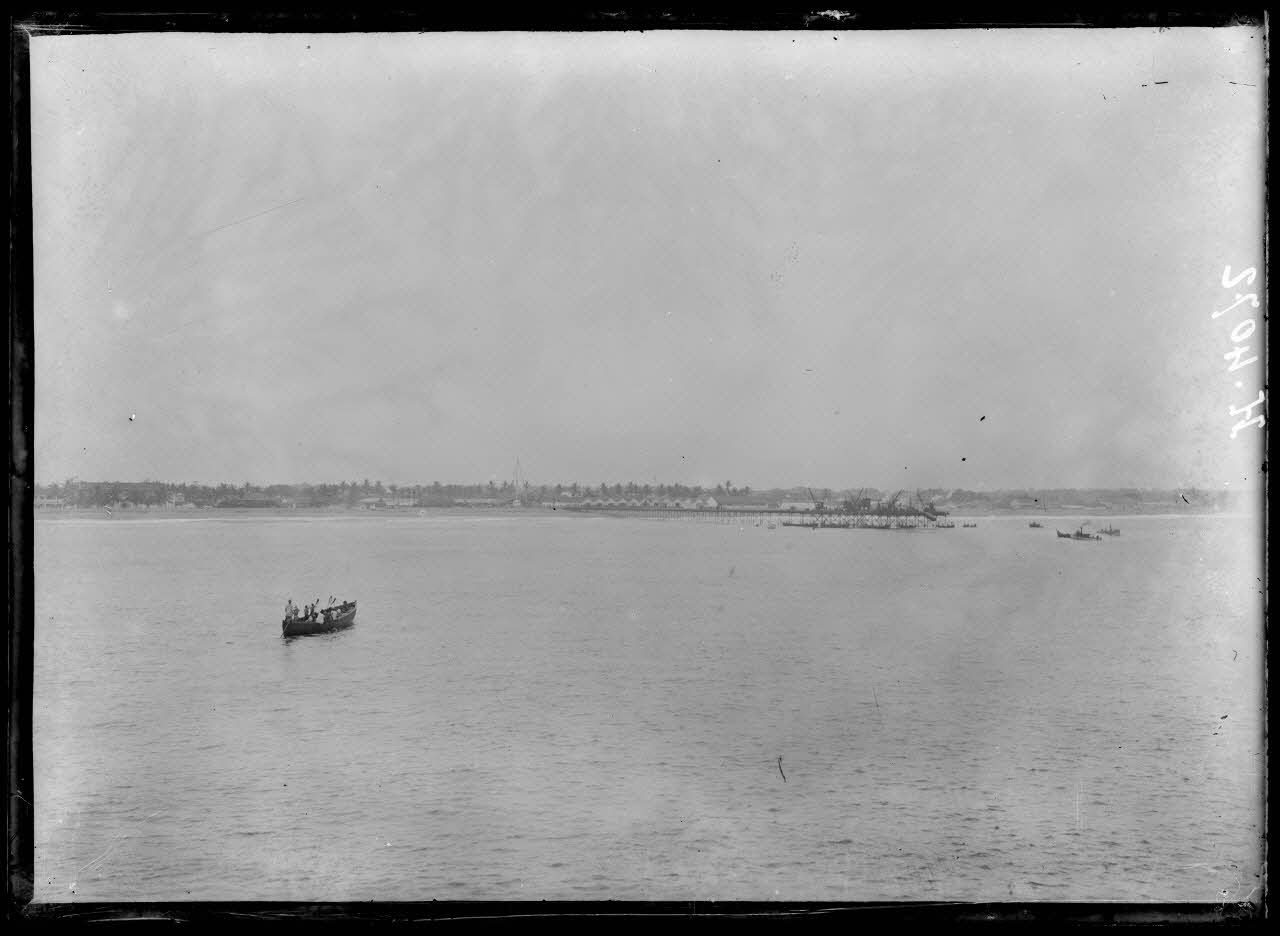 Au large de Kotonou, l'opérateur photographie le ponton et ses grues, ainsi que la côte du Dahomey (aujourd'hui le Bénin).