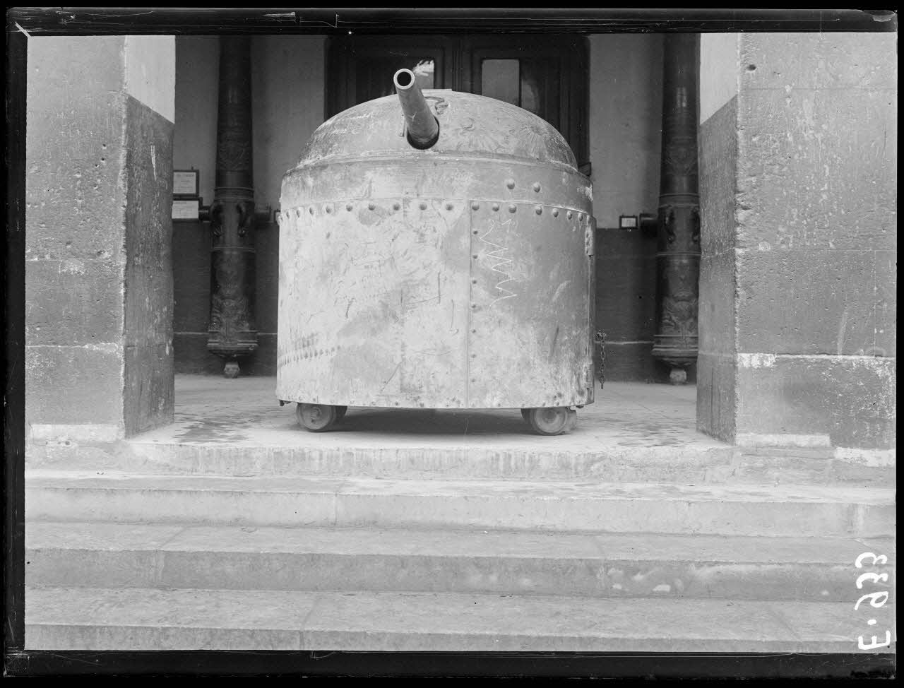 Cour d'honneur des Invalides. Exposition des Trophées de Guerre. Coupole tournante allemande et son canon revolver. [légende d'origine]