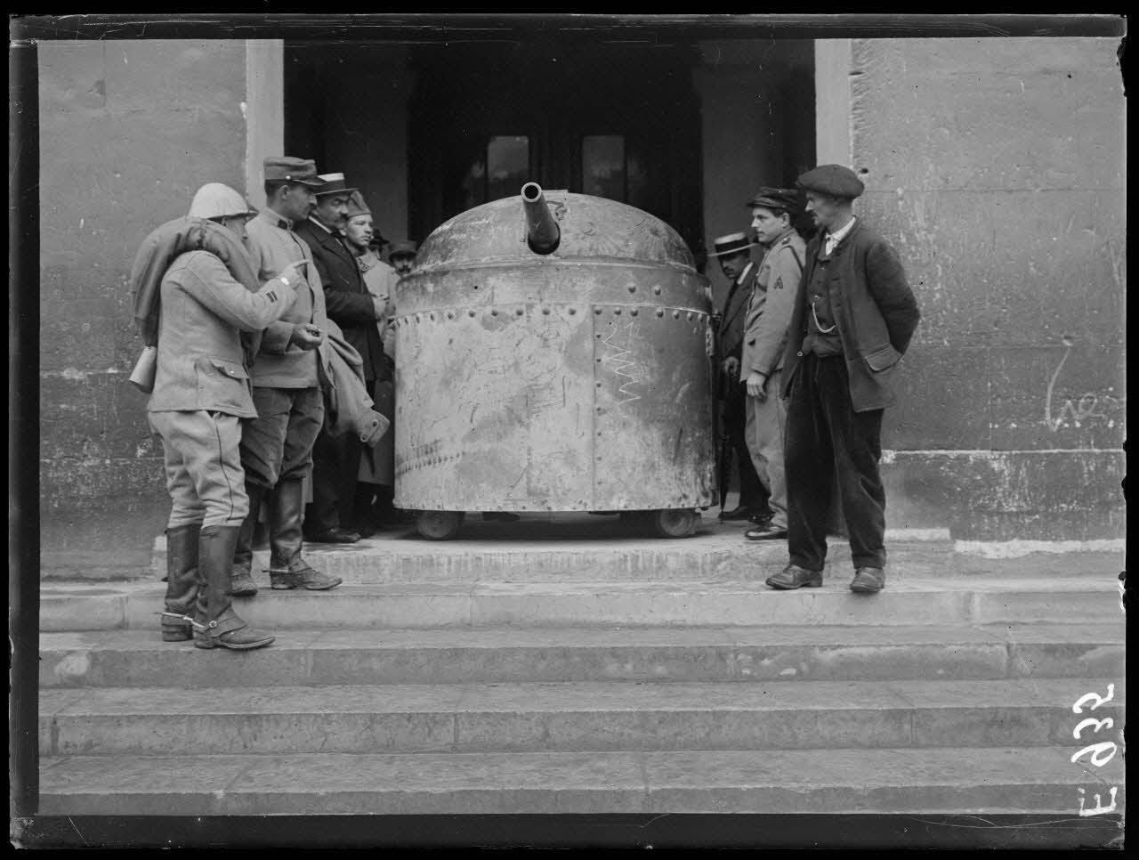 Cour d'honneur des Invalides. Exposition des Trophées de Guerre. Une coupole tournante allemande et son canon revolver. [légende d'origine]