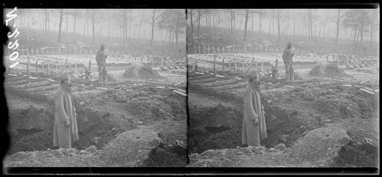 Courlandon (Marne). Le cimetière de Courlandon bombardé par les avions allemands. Tombes bouleversées.
