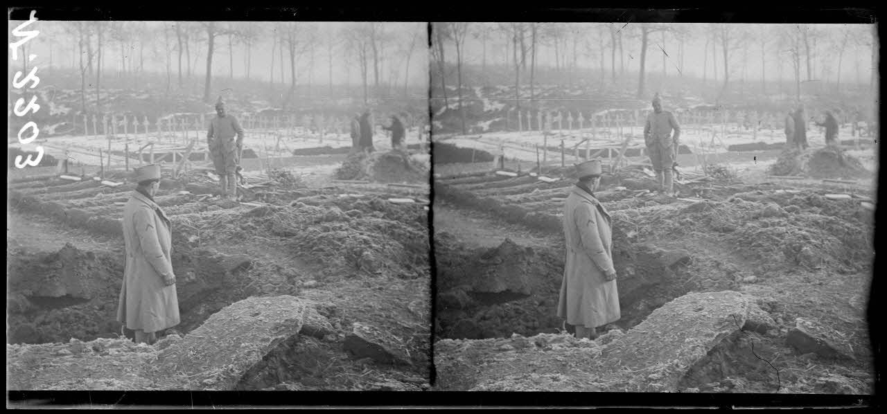 Courlandon (Marne). Le cimetière de Courlandon bombardé par les avions allemands. Tombes bouleversées. [légende d'origine]