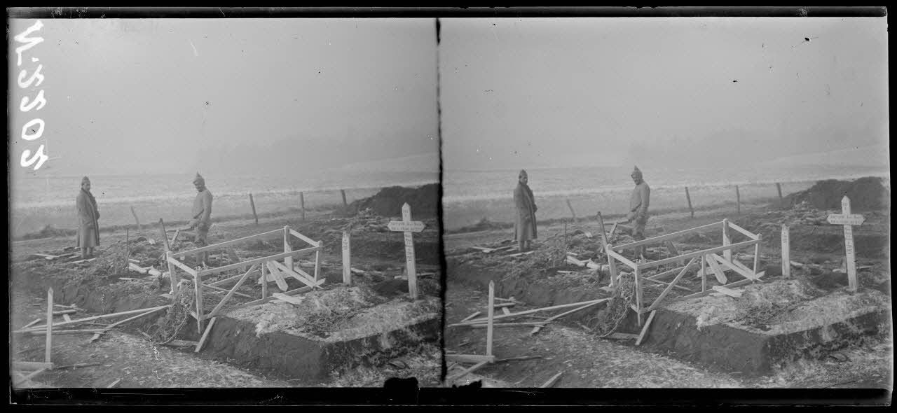 Courlandon (Marne). Le cimetière de Courlandon bombardé par les avions allemands. Tombes bouleversées. [légende d'origine]