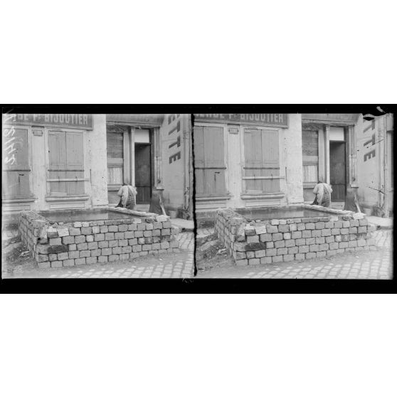 - Dans Reims, l'hôtel de ville est en ruine quelques mois après l'incendie qui dévasta le bâtiment. Au coin d'une rue, une affiche appelle les Français à souscrire au 3e emprunt national. Des réserves d'eau ont été installées par les sapeurs-pompiers.