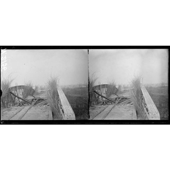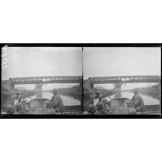 Gernicourt (Aisne). Sur le canal de l'Aisne, à bord d'un canot ambulance ; un pont atteint par un obus (4-12-17).
