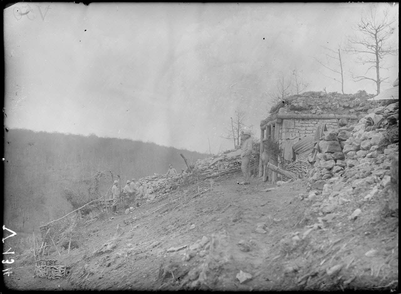 - Á La Pierre Croisée (Marne, 07/12/1915, V 90 et V100), les soldats construisent un blockhaus pour mitrailleuse.