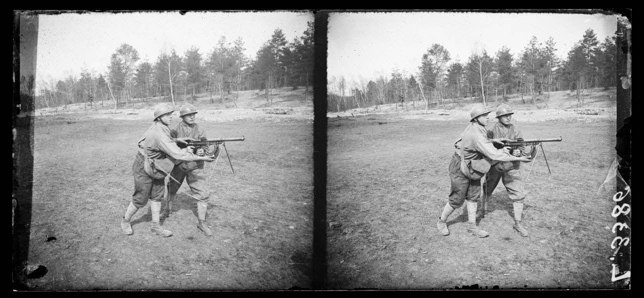 - à Cousances-les-Forges, au centre d'instruction de la 2e armée. Exercices de tirs au Chauchat M 15 (fusil mitrailleur modèle 1915), des soldats s'exercent à ramper avec leur fusil dans les bras (SPA 70 L 3388), à marcher à genoux avec leur arme (SPA 70 L 3390), un capitaine inspecte une section au garde-à-vous derrière leurs armes (SPA 70 L 3390), des soldats en position d'attente pour le tir derrière leur FM (SPA 70 L 3393), le tir en marchant (SPA 70 L 3394), le tir couché (SPA 70 L 3395) ;