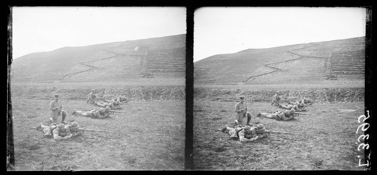 - à Cousances-les-Forges, au centre d'instruction de la 2e armée. Exercices de tirs au Chauchat M 15 (fusil mitrailleur modèle 1915), des soldats s'exercent à ramper avec leur fusil dans les bras (SPA 70 L 3388), à marcher à genoux avec leur arme (SPA 70 L 3390), un capitaine inspecte une section au garde-à-vous derrière leurs armes (SPA 70 L 3390), des soldats en position d'attente pour le tir derrière leur FM (SPA 70 L 3393), le tir en marchant (SPA 70 L 3394), le tir couché (SPA 70 L 3395) ;