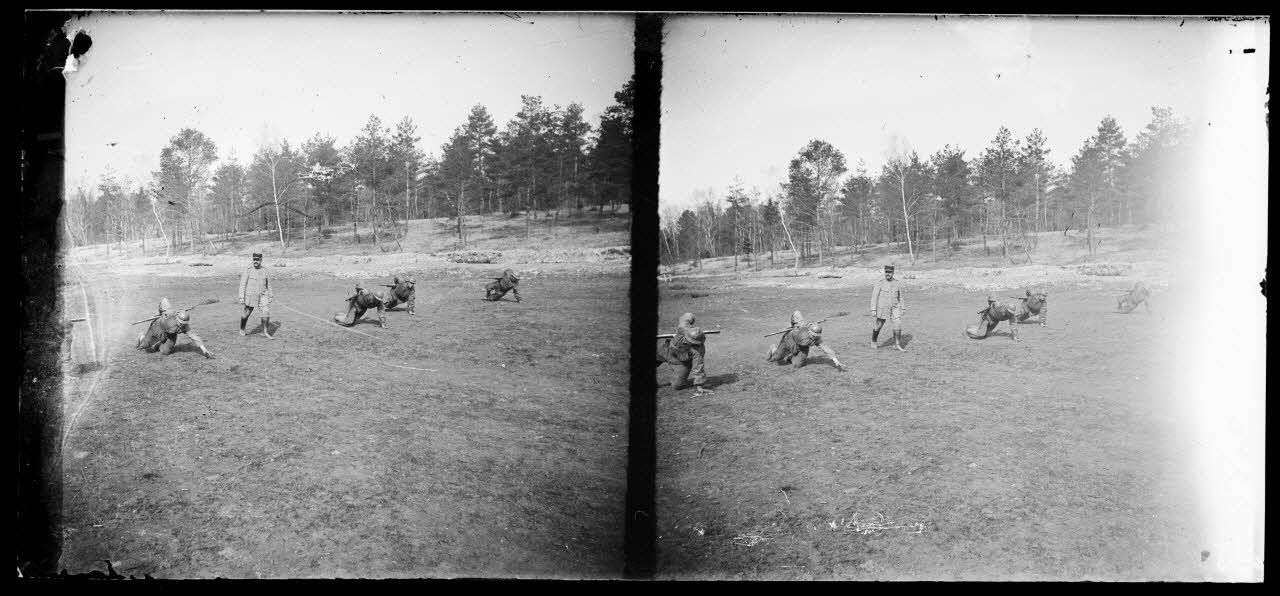 - à Cousances-les-Forges, au centre d'instruction de la 2e armée. Exercices de tirs au Chauchat M 15 (fusil mitrailleur modèle 1915), des soldats s'exercent à ramper avec leur fusil dans les bras (SPA 70 L 3388), à marcher à genoux avec leur arme (SPA 70 L 3390), un capitaine inspecte une section au garde-à-vous derrière leurs armes (SPA 70 L 3390), des soldats en position d'attente pour le tir derrière leur FM (SPA 70 L 3393), le tir en marchant (SPA 70 L 3394), le tir couché (SPA 70 L 3395) ;