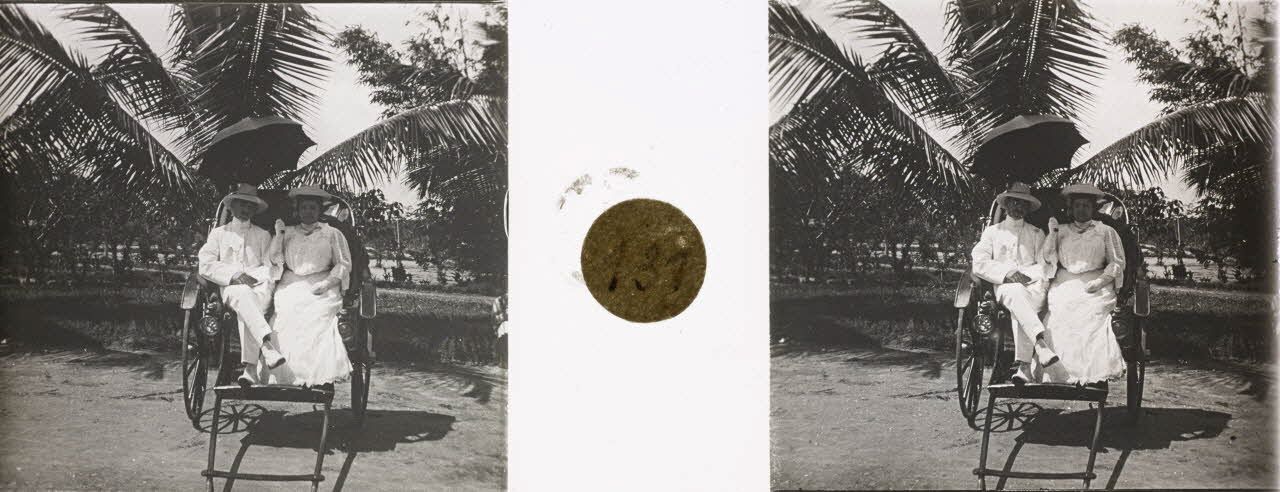 Femme à l'ombrelle et homme dans un pousse-pousse.