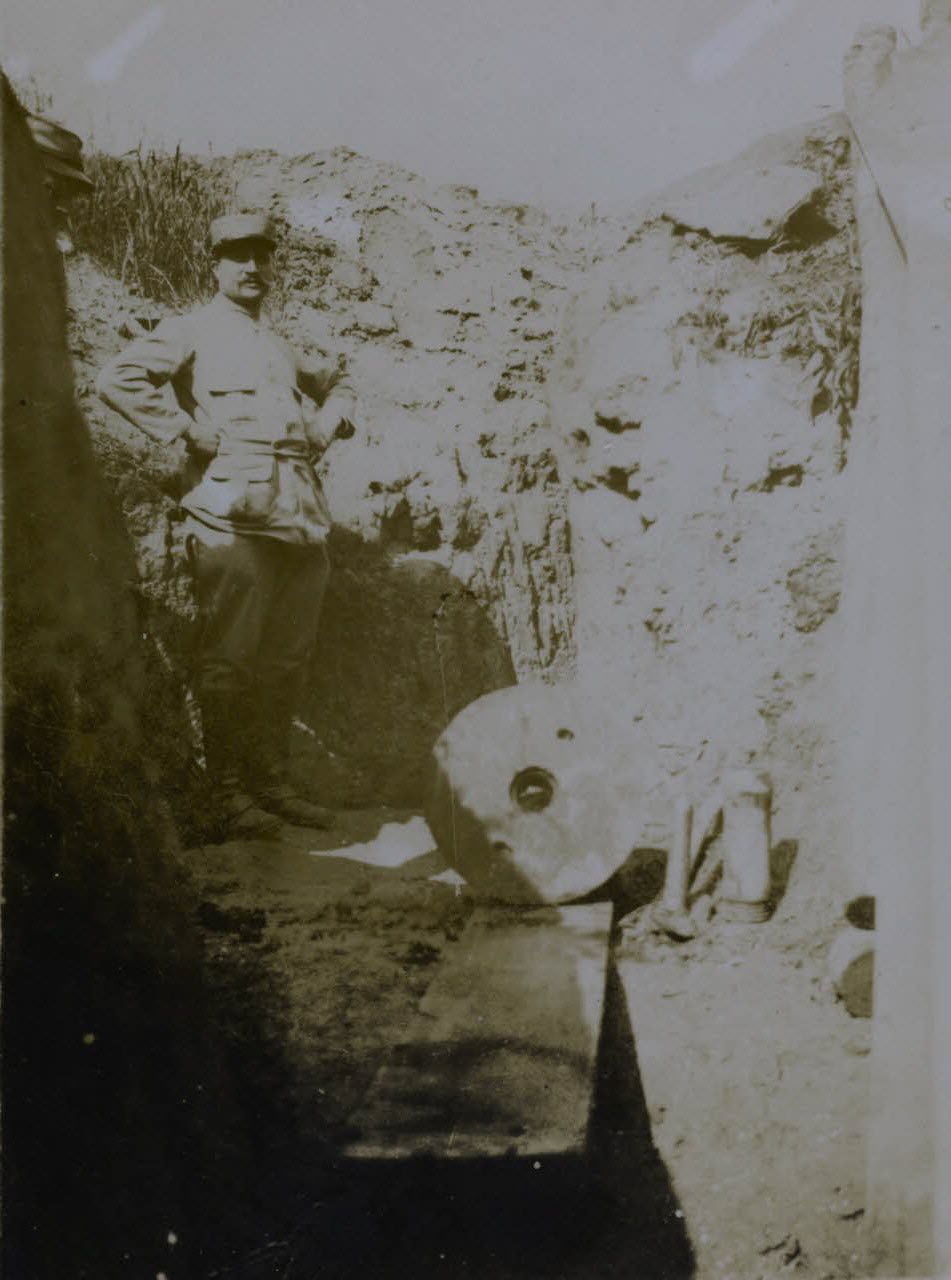 Les archives photographiques du médecin major Augarde, affecté au 138e régiment d''infanterie, sont caractéristiques de la production d''images fixes des militaires pendant la Grande Guerre : portraits de camarades, édifices religieux et terrains dévastés par les bombardements ennemis, etc. Les photographies cotées en D0349-003 étaient conditionnées dans une enveloppe intitulée « L’Artois / Parrajou ».