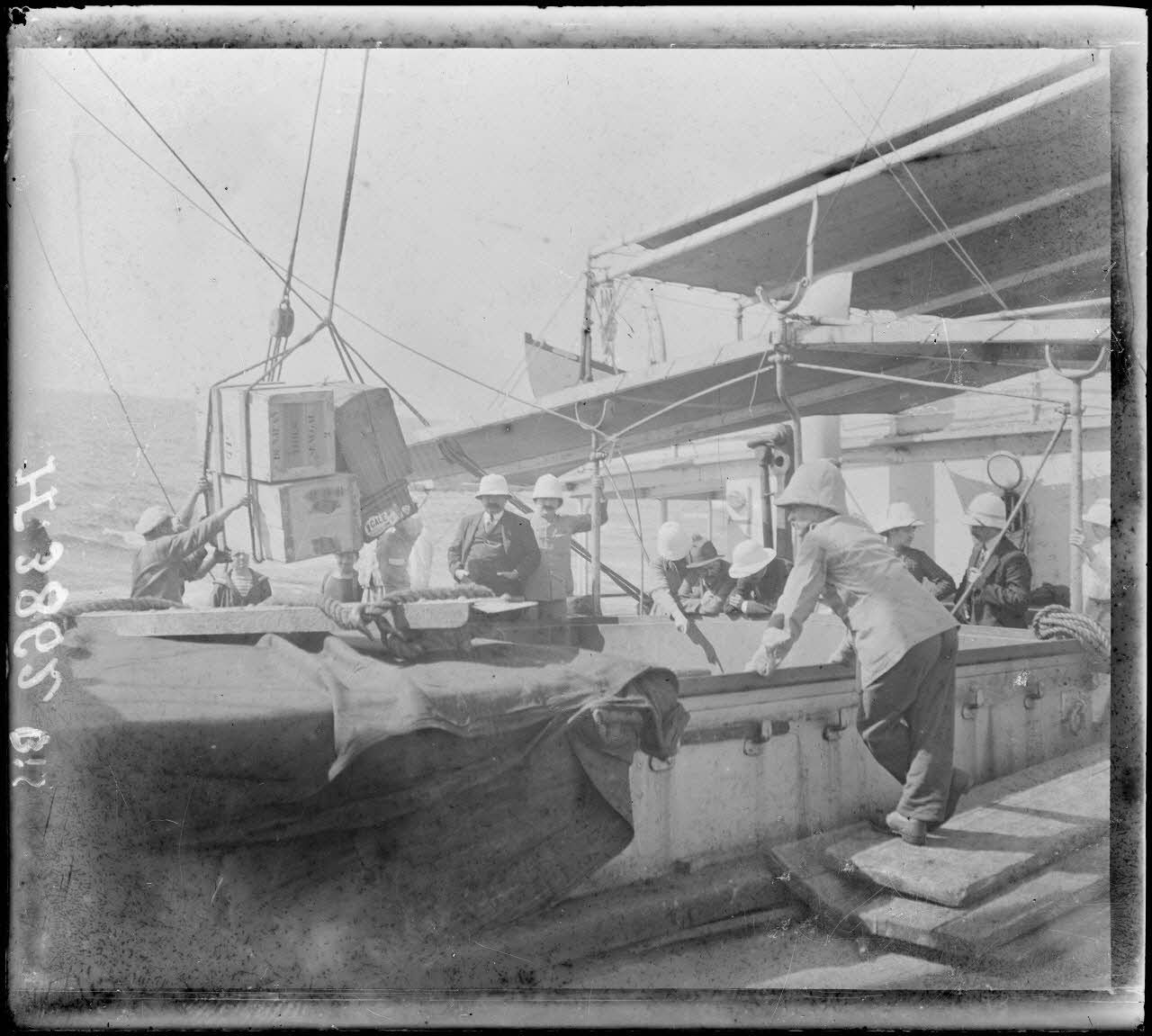 Devant Dakar, des marins déchargent des caisses de marchandises et un coffre de la cale du du paquebot l'"Afrique", sous les yeux des passagers.