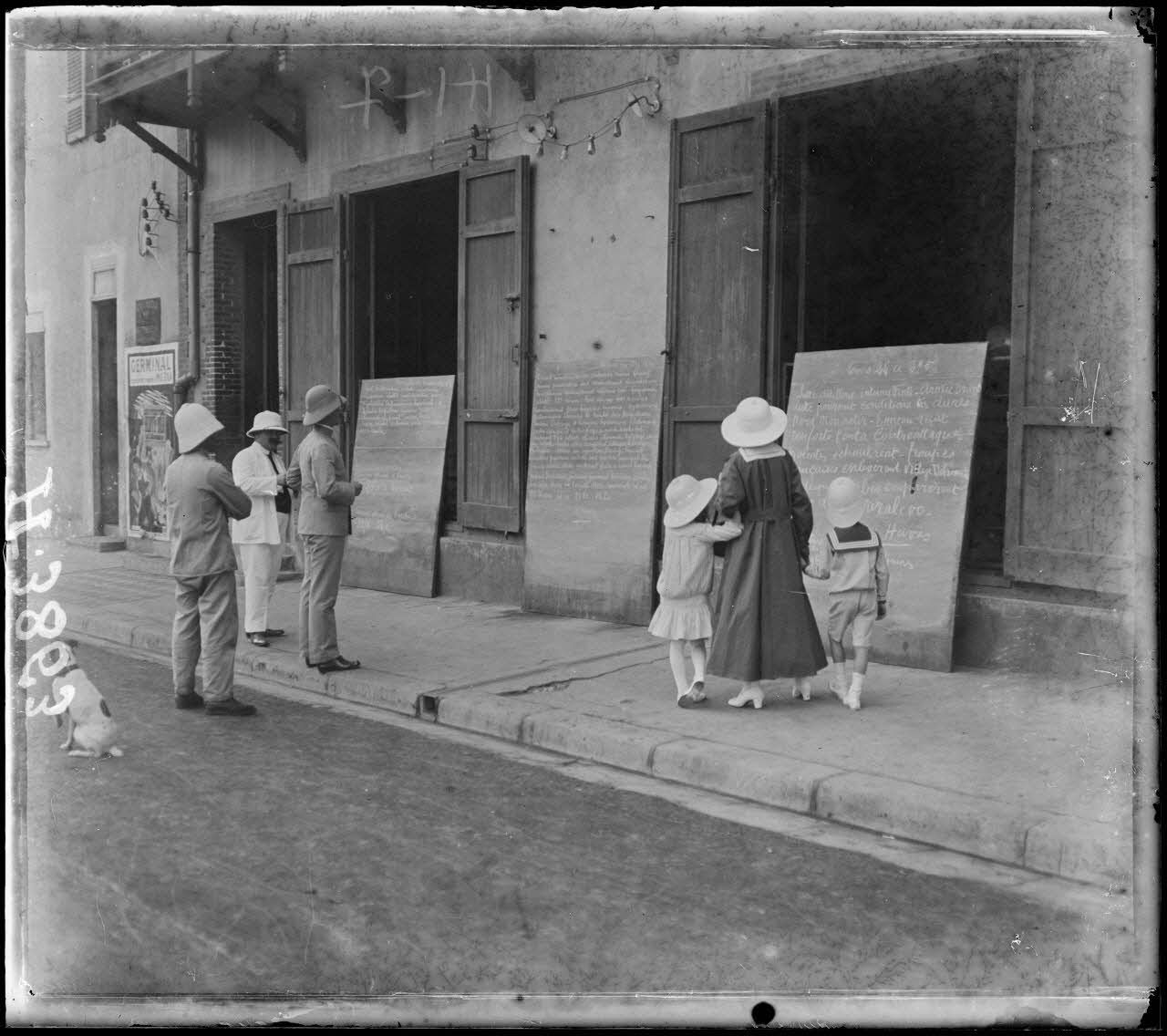 Dans une rue de Dakar, des civils européens lisent des communiqués de l'agence Havas écrits à la main sur de grands tableaux noirs et rédigés dans un style télégraphique. Le communiqué de droite, du 24 novembre à 2h 05, traite essentiellement des combats en Orient : "lutte artillerie intermittente - armée orient lutte poursuit conditions très dures nord Monastir - Ennemi reçut renforts tenta contre attaques violentes échouèrent - troupes françaises enlevèrent village Dobromir ...". Sur le communiqué du milieu, il est question du bombardement d'un torpilleur par des hydravions à Zeebruge et de la mort de Guynemer dont l'avion est abattu le 22.