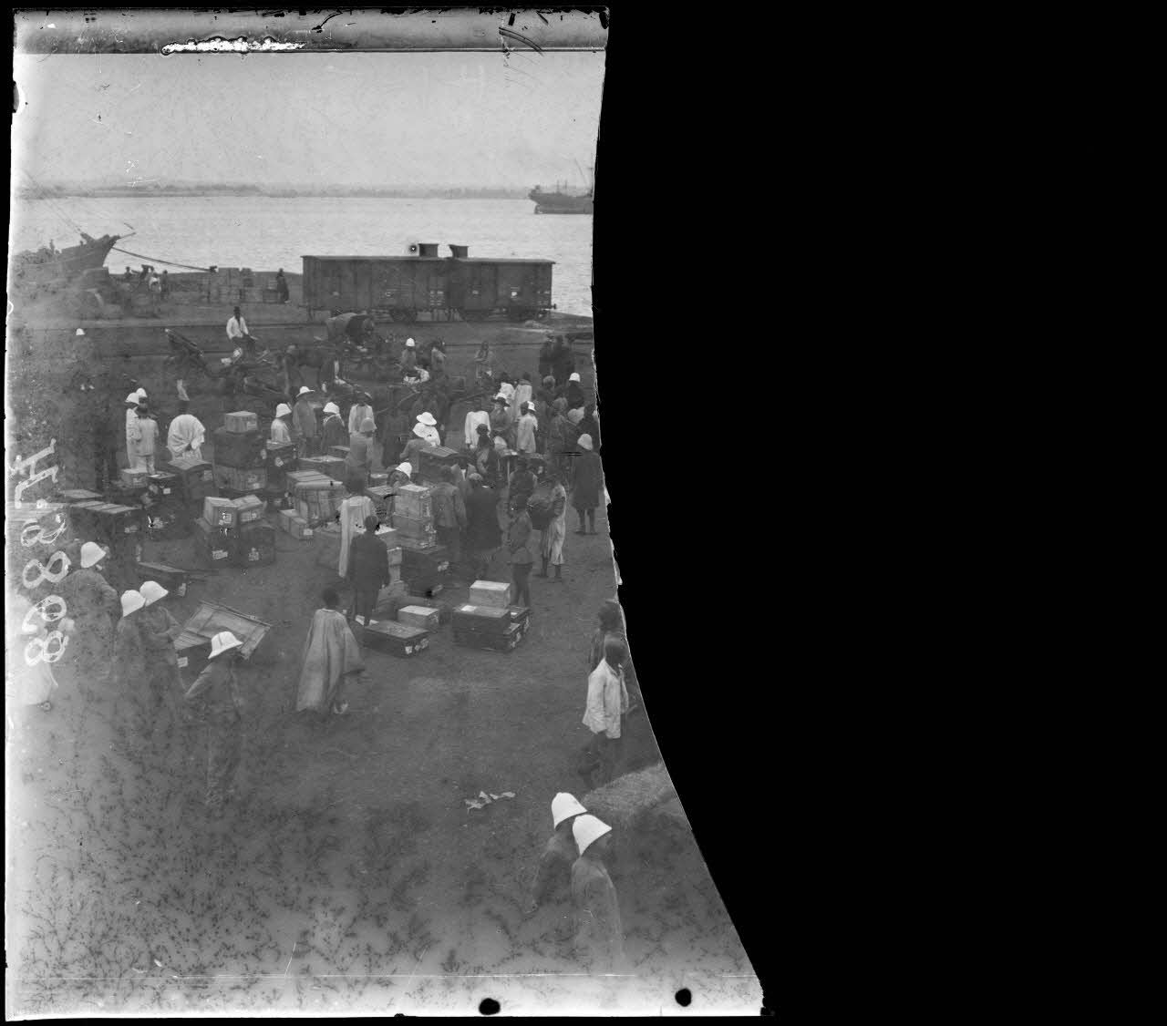 Sur le port de Dakar, des Européens et des autochtones déambulent au milieu des caisses et des malles entassées sur le quai, près de deux wagons.