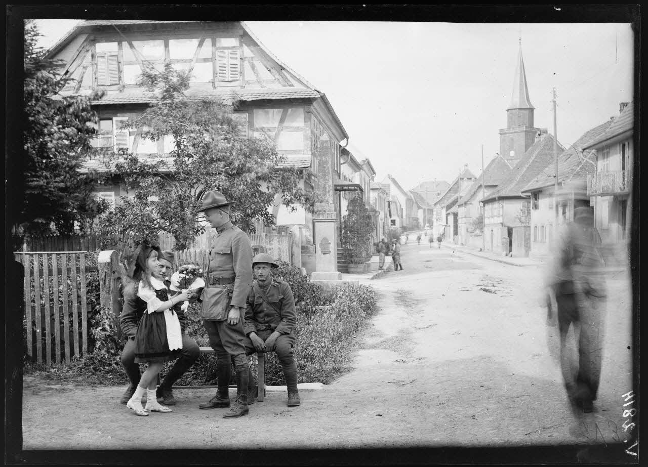 - Dans le village de Grandvillars (Territoire de Belfort, 30/05/1918, V 2790 à V 2814), les soldats du 370e RIUS (régiment d'infanterie américain) sont stationnés dans la ville. Cette unité de l'armée américaine appartient à la 93rd Infantry Division (93e division d'infanterie américaine) surnommée "Les casques bleus" (en raison du casque Adrian) et composée exclusivement de soldats afro-américains et portoricains. Une revue de la garde est effectuée, puis la fanfare du régiment joue sur la place. Le chef de corps, le colonel Franklin A. Denison, est présent. Le soldats font des mouvements de gymnastique, courant dans les rues de la ville avec leur fusil (Lebel Berthier Mle 1907/1915).