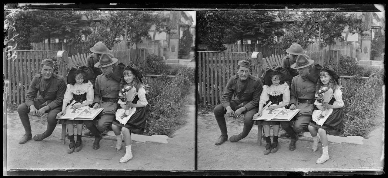 - Dans le village de Grandvillars (Territoire de Belfort, 30/05/1918, V 2790 à V 2814), les soldats du 370e RIUS (régiment d'infanterie américain) sont stationnés dans la ville. Cette unité de l'armée américaine appartient à la 93rd Infantry Division (93e division d'infanterie américaine) surnommée "Les casques bleus" (en raison du casque Adrian) et composée exclusivement de soldats afro-américains et portoricains. Une revue de la garde est effectuée, puis la fanfare du régiment joue sur la place. Le chef de corps, le colonel Franklin A. Denison, est présent. Le soldats font des mouvements de gymnastique, courant dans les rues de la ville avec leur fusil (Lebel Berthier Mle 1907/1915).
