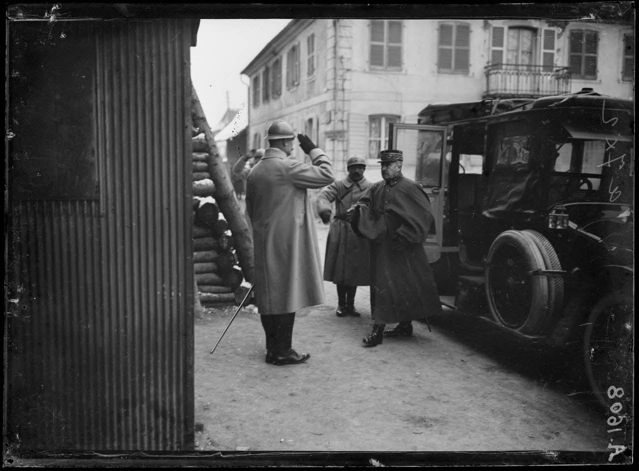 Dannemarie. Arrivée du Général Nivelle au Q. G. de la Division. Le Général Gaucher le reçoit. [légende d'origine]