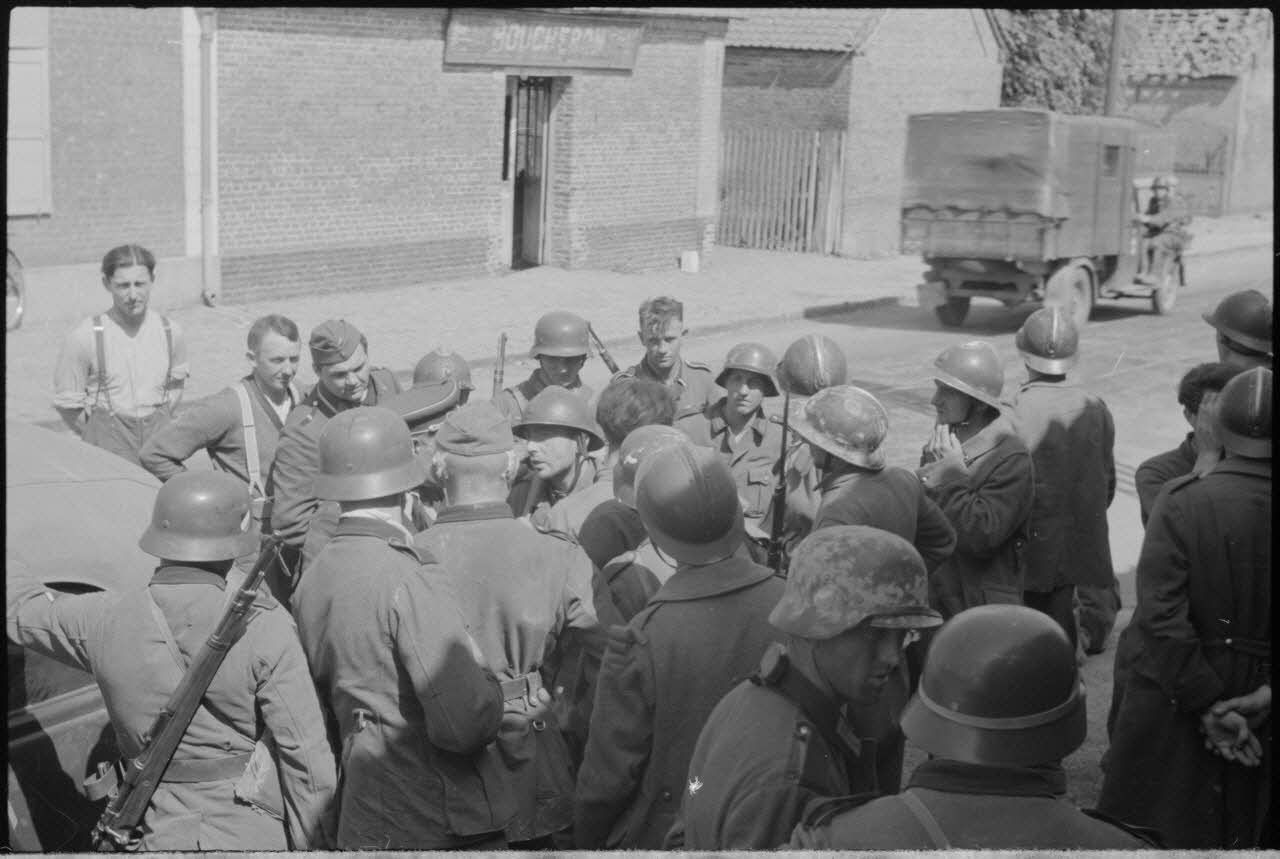 Dans le secteur d'Abbeville, le capitaine von Pebal discute avec un groupe de prisonniers français. Les prisonniers continuent leur route sous escorte de soldats de la Luftwaffe, on reconnaît un panneau de la route nationale 25 signalant la direction de Abbeville à 3,4 kilomètres.