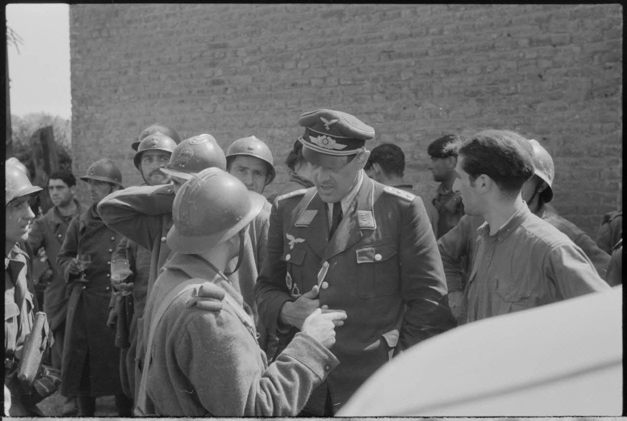 Dans le secteur d'Abbeville, le capitaine von Pebal discute avec un groupe de prisonniers français. Les prisonniers continuent leur route sous escorte de soldats de la Luftwaffe, on reconnaît un panneau de la route nationale 25 signalant la direction de Abbeville à 3,4 kilomètres.