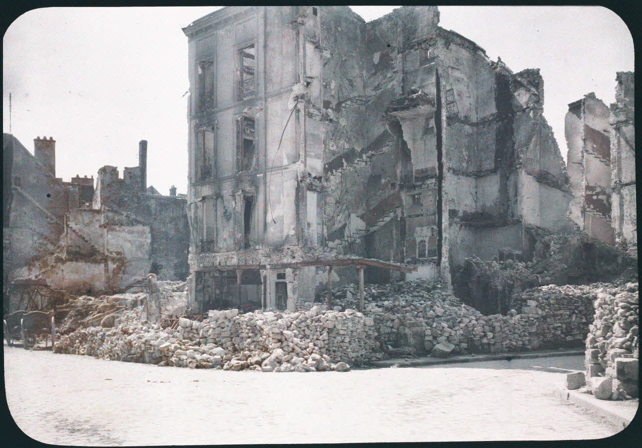 - les ruines et destructions occasionnées par la guerre à Verdun, Reims, Arras ou ailleurs : maisons, églises, cathédrales, lieux symboliques des grandes villes de province en ruines ;
