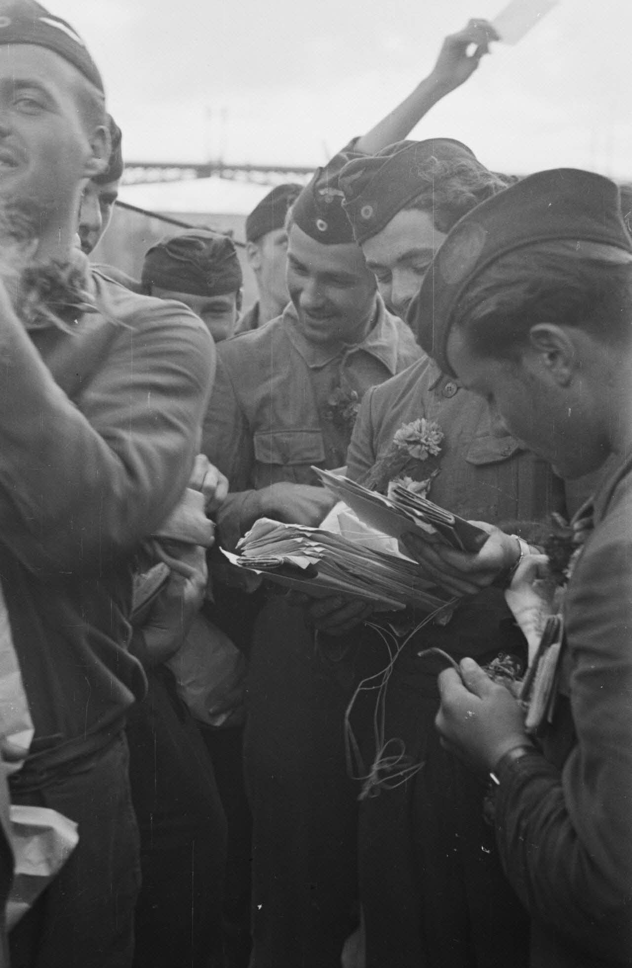 Dans l'arsenal de Brest, la distribution du courrier à l'équipage du sous-marin U-203 après son retour de mission en mer.