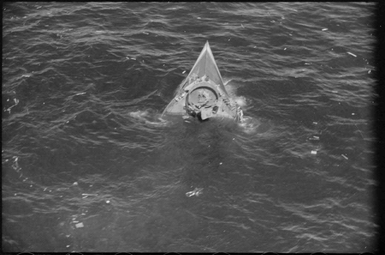 En Crète, la baie de Sude (Suda), décollage d'un hydravion Arardo Ar-196 et un navire qui sombre dont la proue dépace des flots.