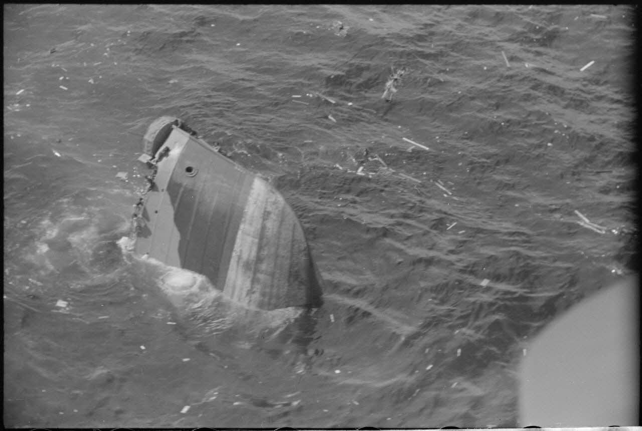 En Crète, la baie de Sude (Suda), décollage d'un hydravion Arardo Ar-196 et un navire qui sombre dont la proue dépace des flots.