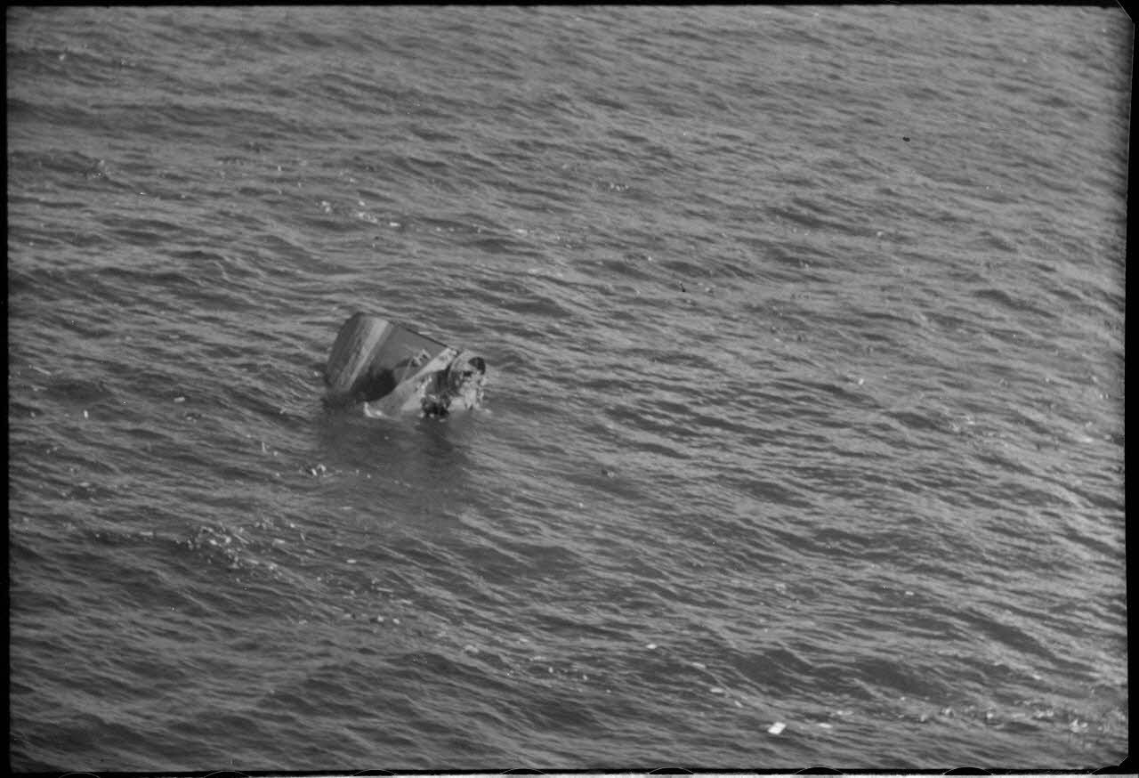 En Crète, la baie de Sude (Suda), décollage d'un hydravion Arardo Ar-196 et un navire qui sombre dont la proue dépace des flots.