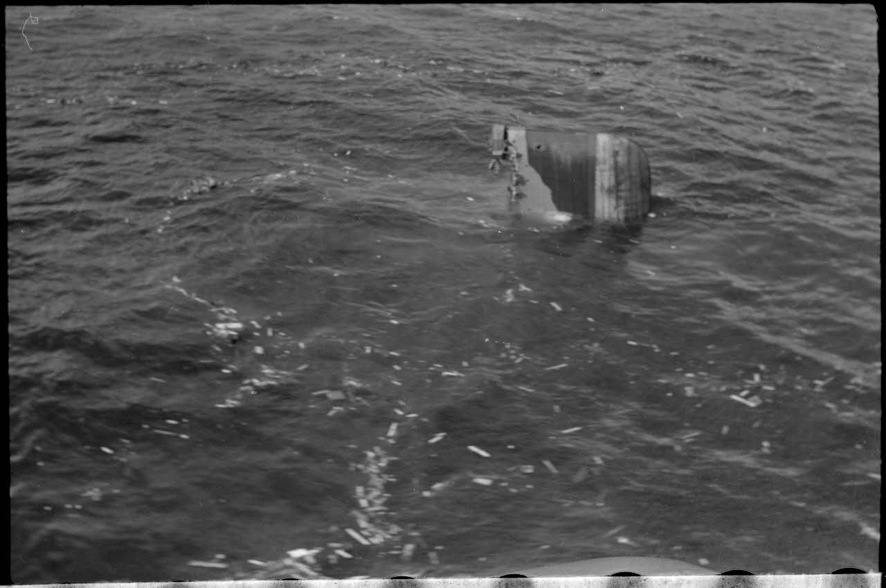 En Crète, la baie de Sude (Suda), décollage d'un hydravion Arardo Ar-196 et un navire qui sombre dont la proue dépace des flots.