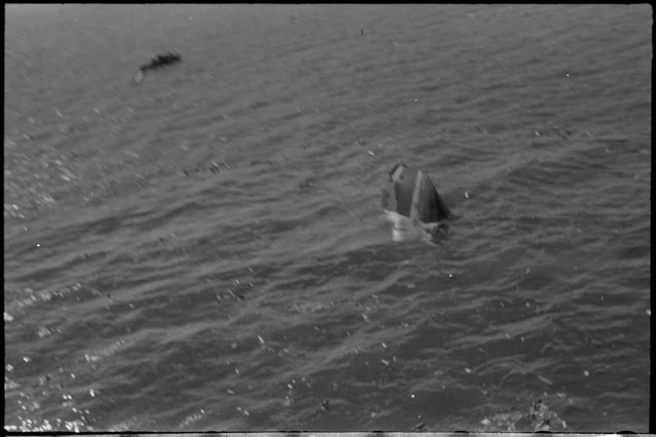 En Crète, la baie de Sude (Suda), décollage d'un hydravion Arardo Ar-196 et un navire qui sombre dont la proue dépace des flots.