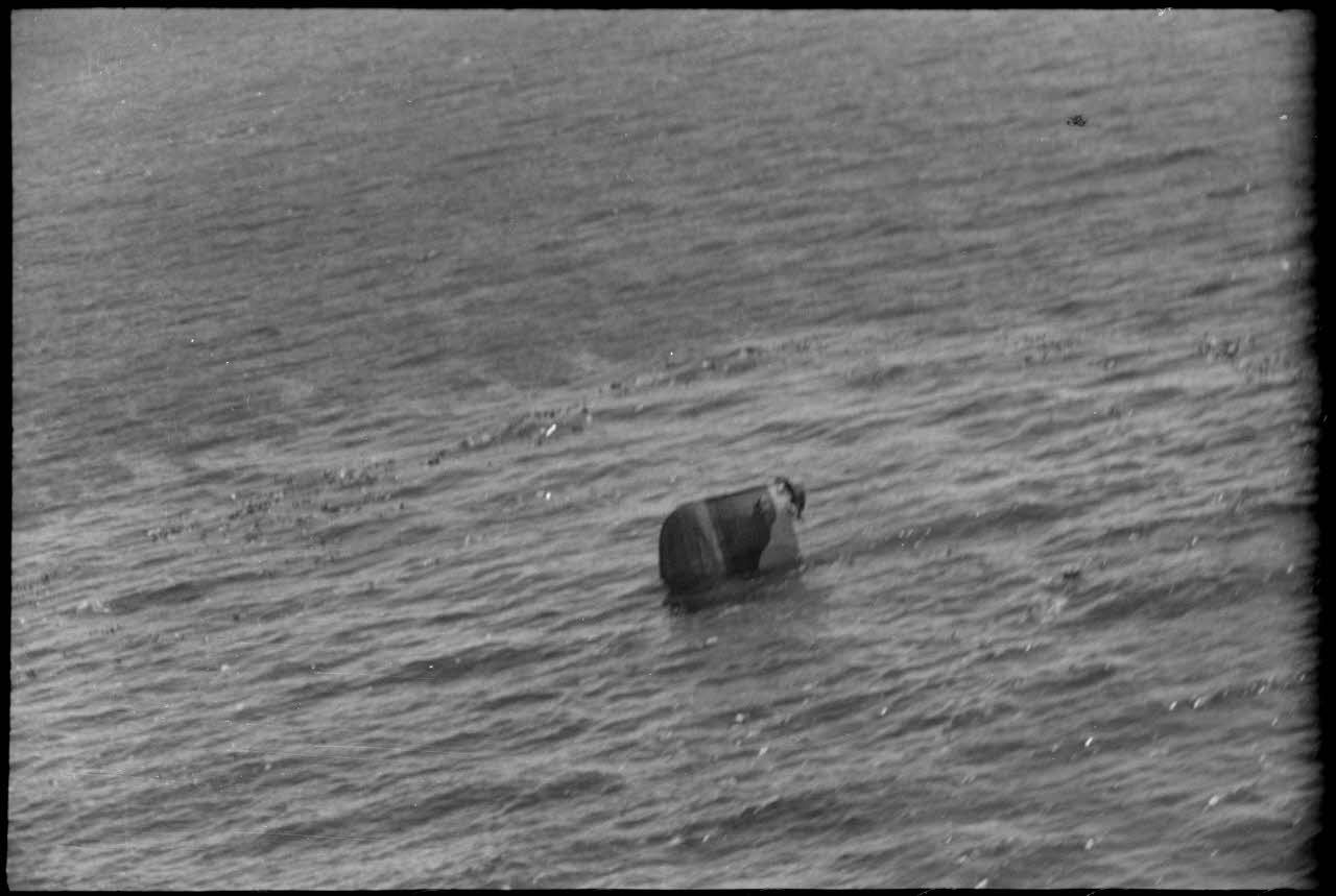 En Crète, la baie de Sude (Suda), décollage d'un hydravion Arardo Ar-196 et un navire qui sombre dont la proue dépace des flots.