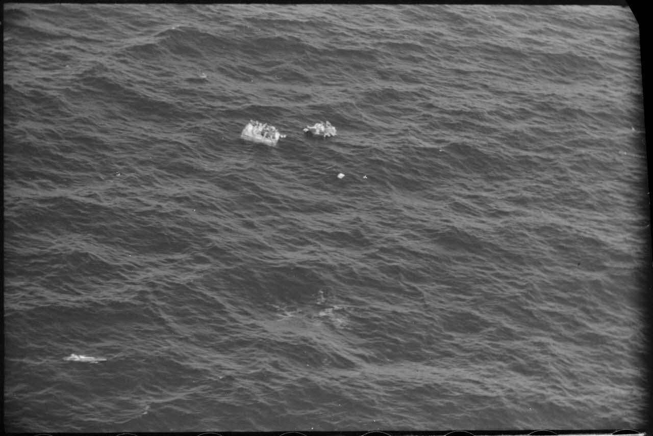 En Crète, la baie de Sude (Suda), décollage d'un hydravion Arardo Ar-196 et un navire qui sombre dont la proue dépace des flots.