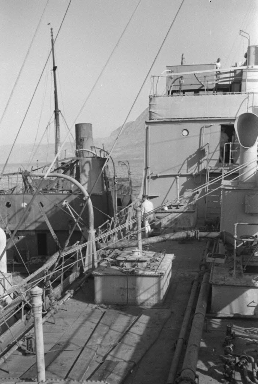 Dans la baie de la Sude (Souda Bay), le ravitaillement en pétrole d'un navire allemand.