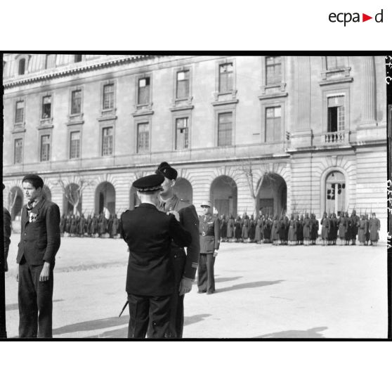 Dans la caserne du Muy à Marseille, le général Cochet décore de la croix de guerre et/ou de la médaille militaire, un homme des FFI (Forces françaises de l'intérieur).