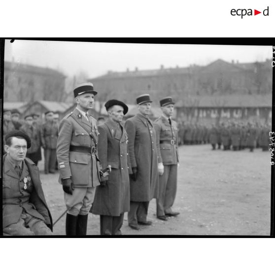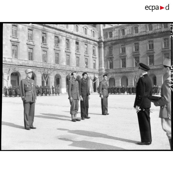 Militaires tout juste décorés ou récipiendaires dans la cour d'une caserne de Lyon.