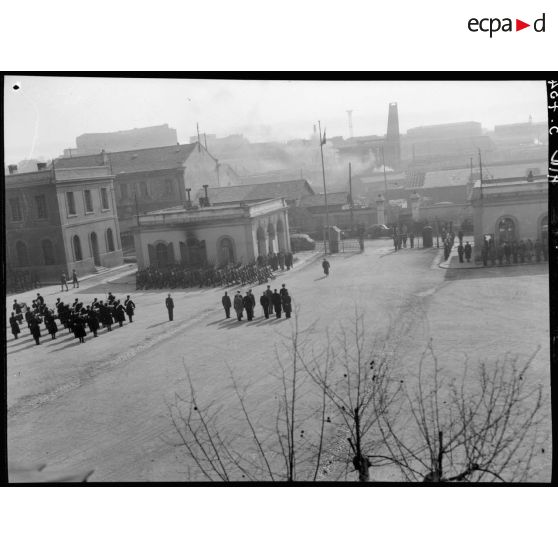 Vue en plongée d'une caserne à Lyon, dans laquelle se déroule une prise d'armes présidée par le général de corps aérien Cochet.