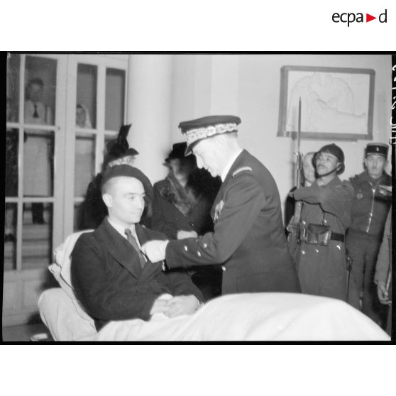 Le général de corps aérien Cochet décore un blessé probablement des FFI.