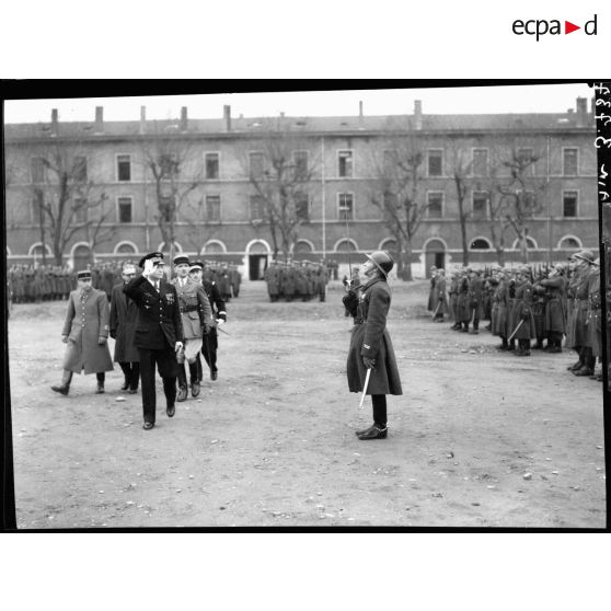 Revue des troupes par le général de corps aérien Cochet dans une caserne à Lyon.