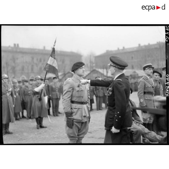 Le général de corps aérien Cochet décore de la médaille militaire et de la croix de guerre, un chasseur blessé et mutilé dans la cour d'une caserne de Lyon.