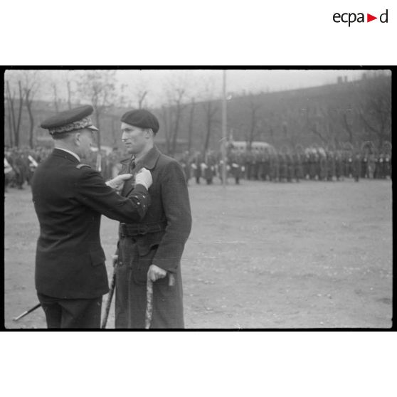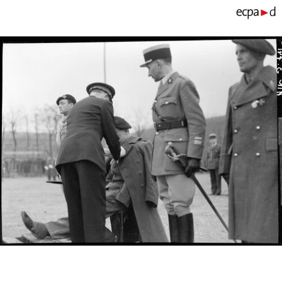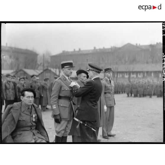 Dans la caserne du Muy à Marseille, le général Cochet décore un capitaine (auquel il manque un bras).