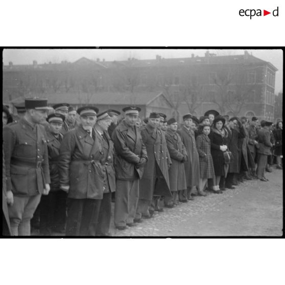 Dans une caserne à Lyon, le général Cochet, accompagné d'autres chefs militaires, salue les troupes et le drapeau d'une unité de l'infanterie, puis procède à une remise de décorations destinées à deux colonels, à un commandant, à un civil blessé et à deux militaires du rang. Les troupes, à la tête desquelles se trouvent trois officiers soviétiques, défilent ensuite dans la cour de la caserne.