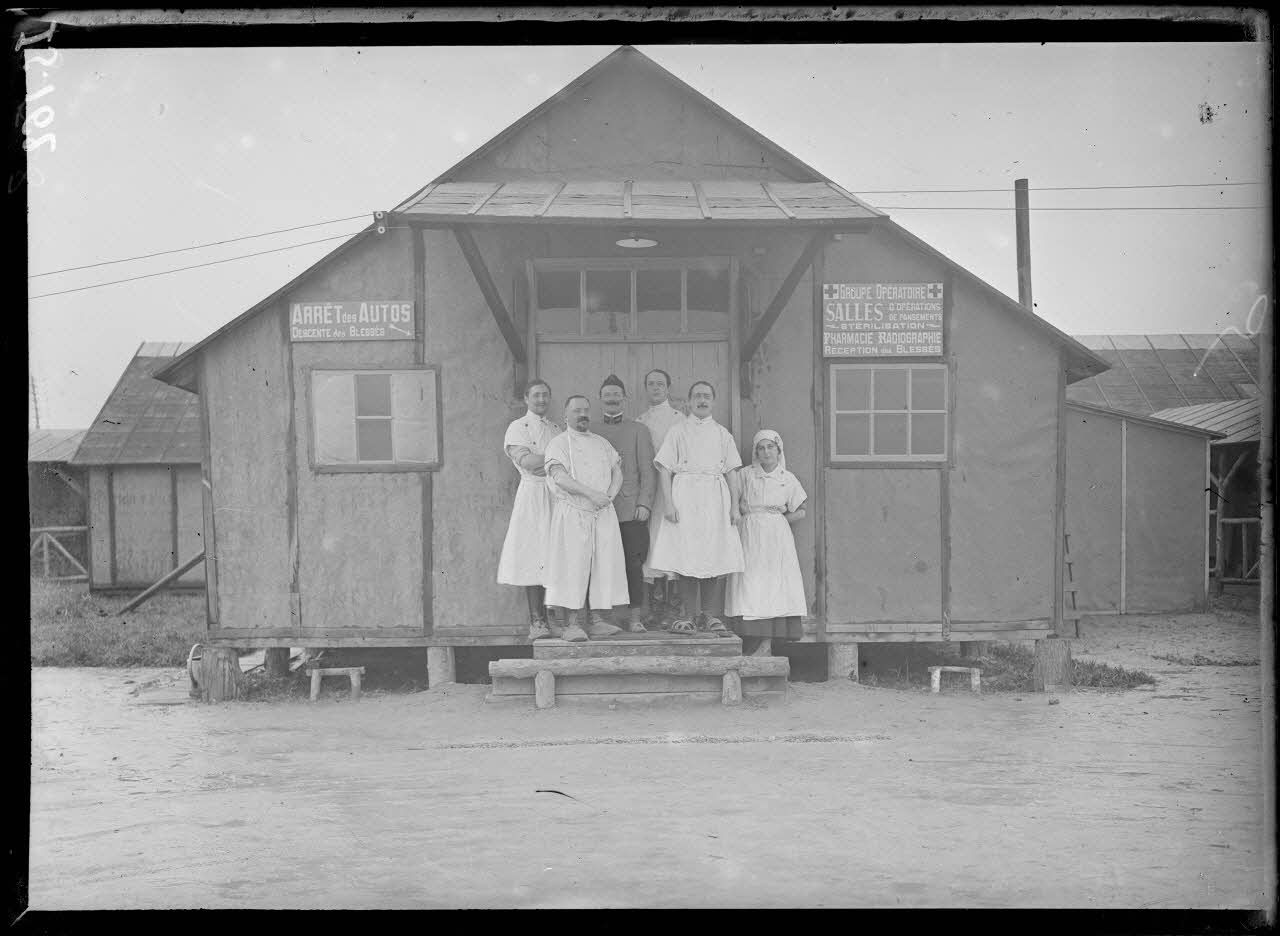 - Près de Reims (IS 155 à IS 165), dans un HOE (hôpital d'origine d'étapes ou d'évacuation), les images des différentes salles de pansements, d'opération, et de soin pour les blessés, ainsi que la pharmacie.