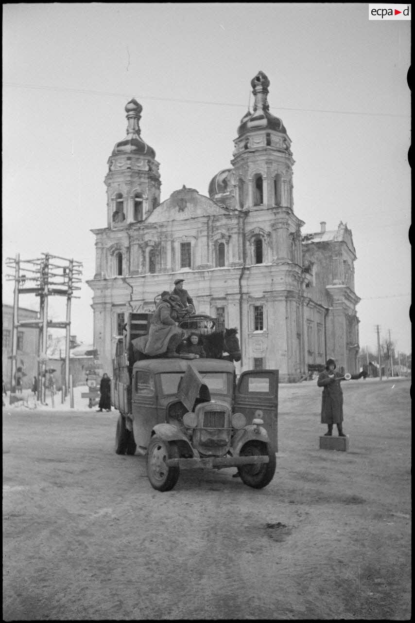 Sur une place de Vitebsk (Witebsk), la circulation est assurée par Feldgendarme, on reconnaît sa plaque hausse-col. Des femmes issues de la minorité allemande, ou qui travaillent pour l'occupant, sourient au photographe qui les immortalise. A la gare de Vitebsk (Witebsk), des permissionnaires de retour de leur foyer vont rejoindre leur garnison. Les soldats déposent leur paquetage sur un traineau pour en faciliter le transport. Les traineaux sont tractés par des enfants qui échangent leur service contre du pain ou des cigarettes.