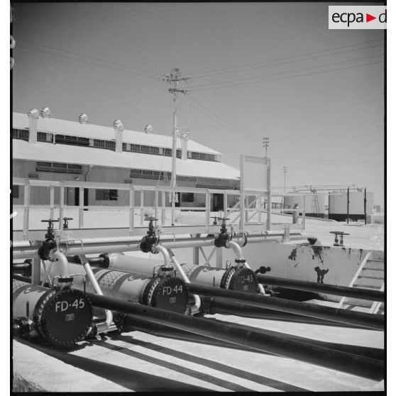 Dans le désert, plan général d'une station de pompage sur l'oléoduc de Kirkuk (Irak) à Tripoli.