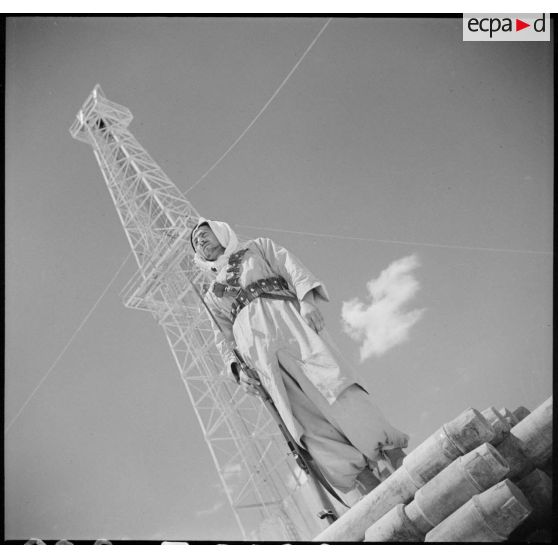 Un méhariste monte la garde devant un derrick.