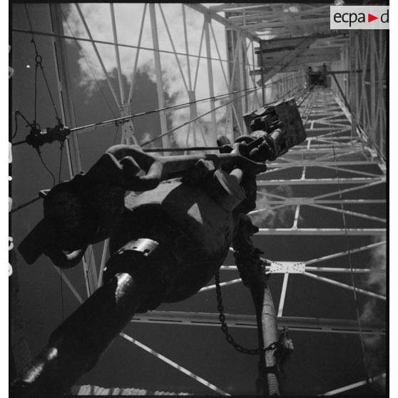 Photographie en contre-plongée des superstructures d'un derrick avec au premier plan le trépan.